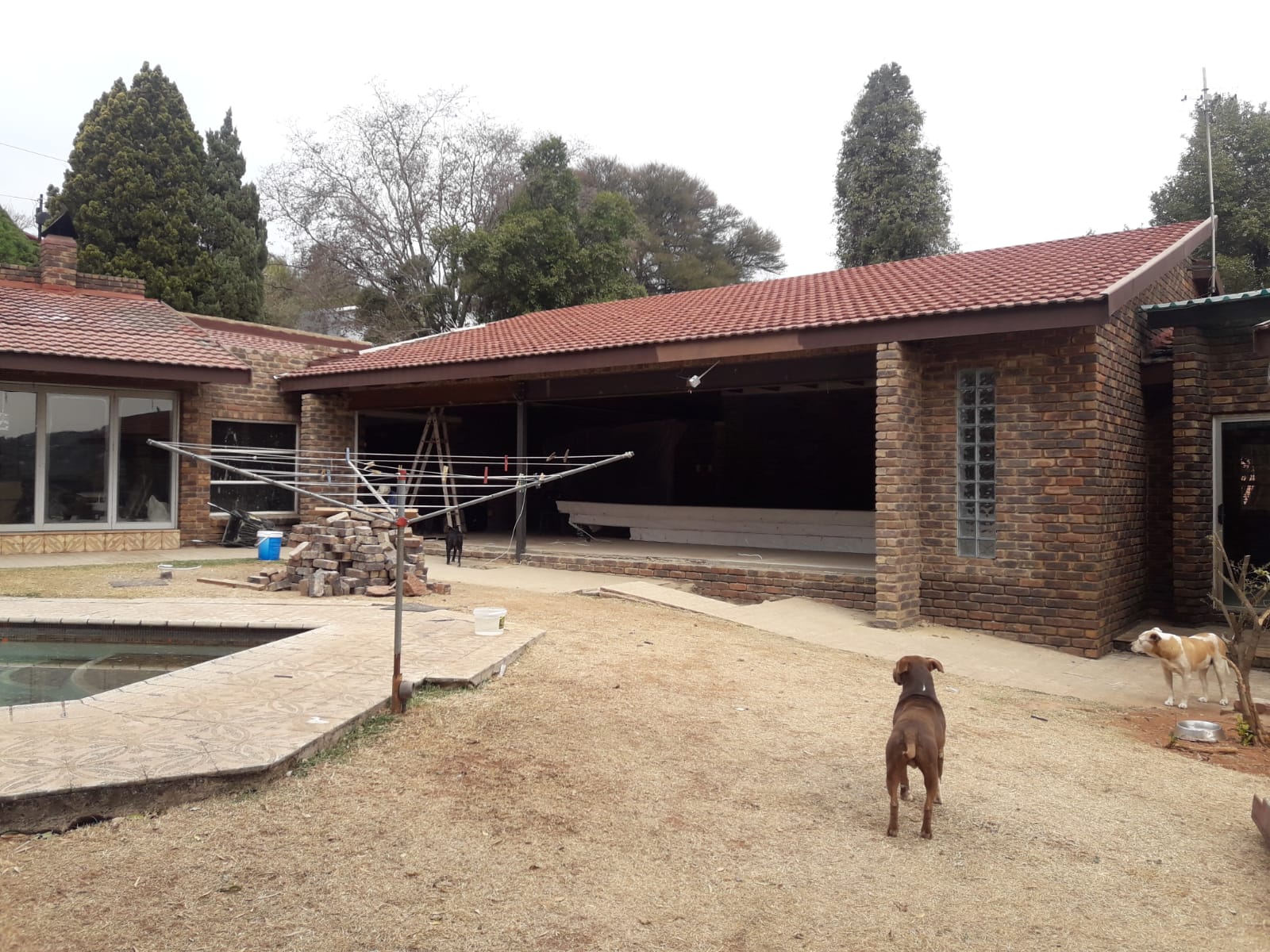 The original house was completed in the early 1980s on a steep west facing slope. It consists of five separate face brick structures with a skillion roof. One is the garage; the second is the living room, dining room, tv room, study and kitchen; the third one has the three bedrooms and two bathrooms; the fourth is the entrance hall and the fifth the entertainment structures (one part roofed by thatching, the other by concrete tile). Beneath the bedrooms wing is a basement that houses the staff accommodation.