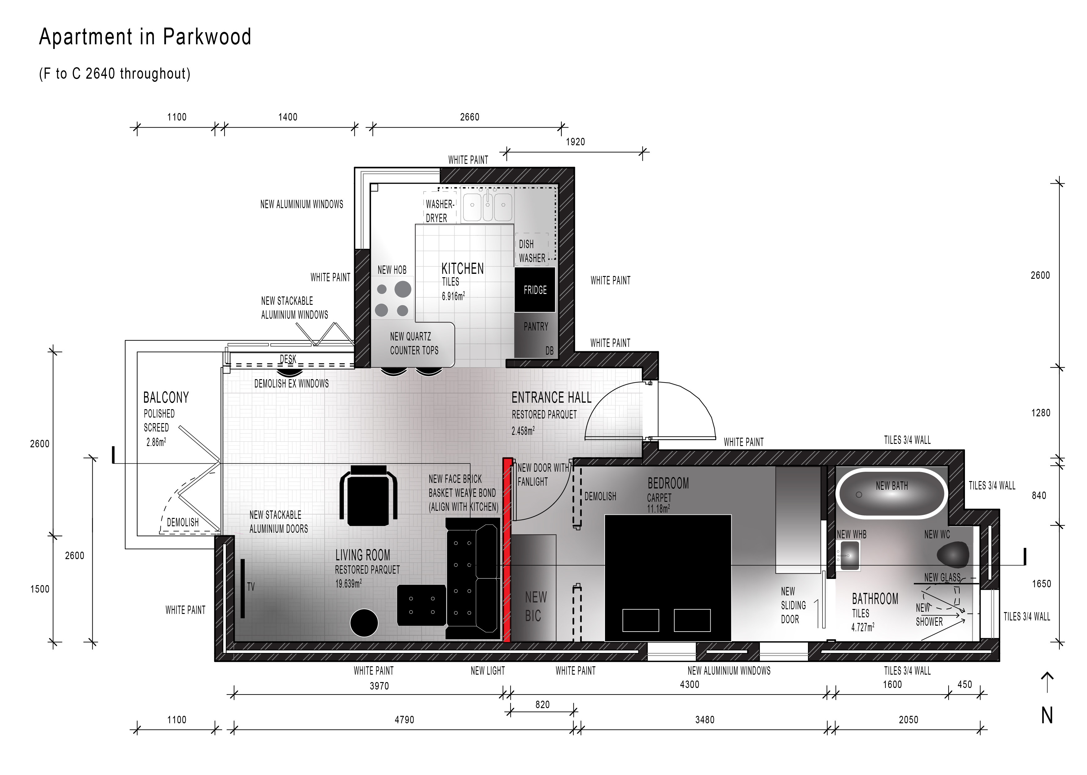 To meet the brief, I enlarged the bedroom by demolishing the existing partition wall between the bedroom and living room and building a new wall from black face brick in basket weave pattern 900mm into the living room. I placed the bedroom door off the entrance hall. This allowed both rooms to be more usable (more storage in bedroom and an uninterupted blank wall in the living room). The face brick is a feature that differentiates the unit. I reconfigured the bathroom by demolishing the existing shower and replacing it with a bathtub, placed a wc nearer to the duct which freed up space to place a separate shower. The kitchen received new counter tops, a gas hob and a new pantry. I removed the laminate floor to reveal the parquet floor.